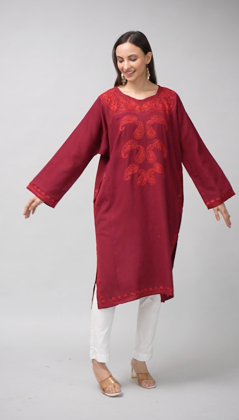 Rang-e-Surkh Deep Maroon Pheran with Tone-on-Tone Aari Kashmiri Embroidery