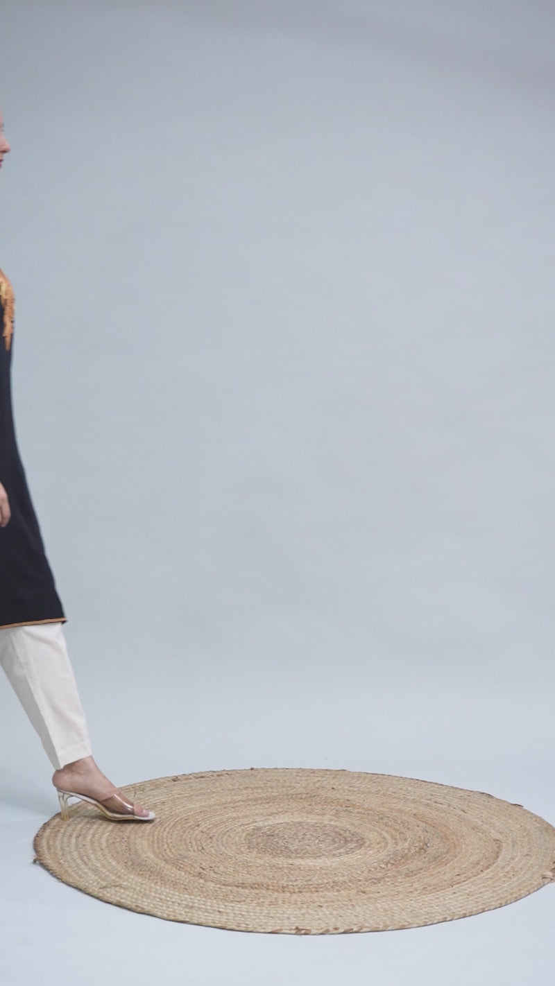 The Golden Boti Tilla embroidery around the neckline and sleeves glimmers with intricate Kashmiri artistry, forming graceful floral and paisley-inspired motifs that elevate its elegance. The contrast of deep black wool against luminous golden tilla adds a regal charm — perfect for festive evenings, cultural events, or casual winter sophistication.